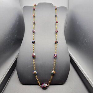 VTG Venetian Murano Millefiori Glass Beaded Station Necklace 31" Gold Plated