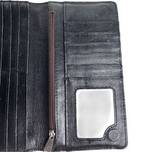 Very good used condition. Patricia Nash black leather wallet. Magnetic closure. Several credit card slots. Minor discoloration on the front but the fold over doesn’t show it. See photo. Approximate Measurements: L 8”, H 4”, Depth 1”.