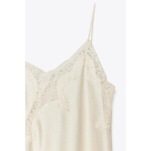 Satin v-neck dress with thin straps. Featuring a lace appliqué and an asymmetric hem with a vent.