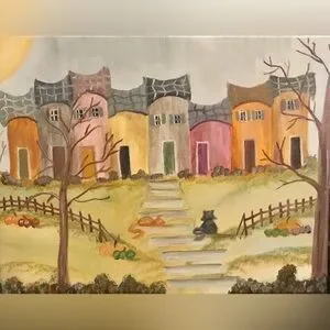 Colorful village scene with unique architecture. Features warm tones and whimsical details. Perfect for adding charm to any space. Original acrylic painting. No frame. 11 x 14 inches