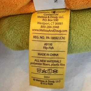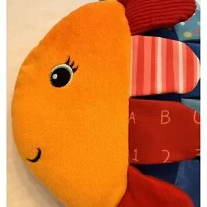 • Melissa & Doug K's Kids Rainbow Fish approx. 13" long. This crinkle toy features multiple textures, colorful fabrics, a built-in baby-safe mirror, and a red textured teether fin—great for engaging visual and tactile play.