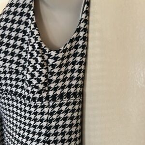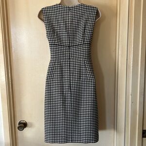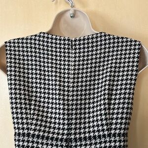Talbots Petite wool black and white houndstooth business casual sheath dress. This dress features a sleeveless, high neck with back zipper. 3 decorative buttons in front. Wide inset waistband. Like new condition.