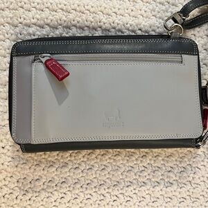 Handy adjustable strap crossbody wallet. Phone pocket on front. Zipper pocket on back for change or keys. 14 card pockets inside, pen pocket and top open for bills. Great for travel, walking, or going out with a minimal bag. Excellent condition. 4x7