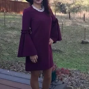 Wine crepe (90% Polyester, 10% Elastane). Hourglass. Long bell sleeves. Crew neckline. Hidden back zipper with exposed button closure at neck. Partially lined. 34" from shoulder to hemline. Made in the USA.