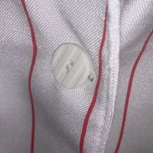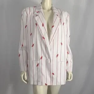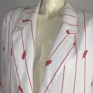 Vintage oversized 1980s blazer single button enclosure. Open front roomy pockets. Bold shoulder. Satin lined. Cherry red pinstripe with leaves.Rayon blend. Machine washable. Extra button inside. Excellent condition. Women size 18.