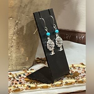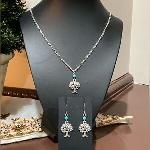 Elegant silver tree pendant necklace and earring set with turquoise accents. Perfect for adding a touch of nature-inspired beauty to any outfit.