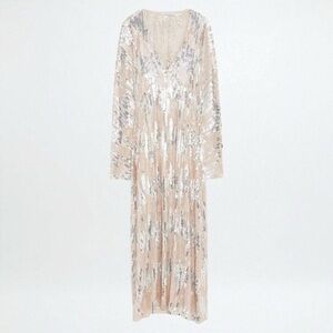 The energy of this Zara silver sequin maxi dress is somewhere between “Studio 54 called, and it wants you” and “yes, I am the main character — thanks for noticing.” With its sweeping silhouette, deep V neckline, and full-body sparkle, this dress does not whisper. It shouts — but like, glamorously.