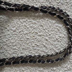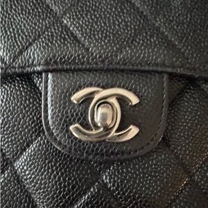 Sophisticated CHANEL shoulder bag in black quilted design. Features elegant silver chain straps and iconic logo clasp.