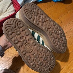Classic Adidas Gazelle sneakers with cream suede and green stripes. Ideal for everyday style.