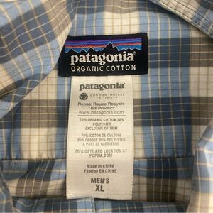 Patagonia Organic Cotton Blend Men’s Short Sleeve Blue Gray Plaid Button Down Shirt Size XL.