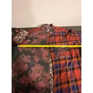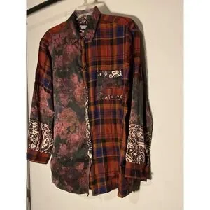 Stand out in this unique Johnny Was Workshop shirt! A captivating clash of patterns defines this long-sleeve button-up, creating a wearable work of art. The shirt features a daring half-and-half design, seamlessly blending a classic red plaid with a moody floral print. Adding another layer of intrigue, the cuffs and chest pocket are adorned with a contrasting geometric pattern, creating a harmonious yet unconventional look. The shirt's relaxed silhouette ensures effortless movement, making it the perfect choice for expressing your individuality and making a bold statement. Wear it to your next art gallery opening, a trendy cafe meetup, or styled casually for an elevated weekend brunch.