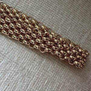 Stylish tan leather belt with elegant gold chain detail. Perfect for enhancing any outfit.