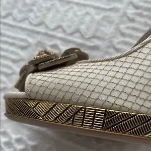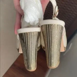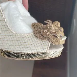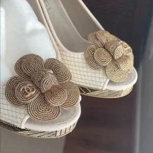 These stunning pumps have a 4.5-inch wedge heel, a leather cross strap, and large gold camellia flower embellishments with Chanel CC's in the center of buckle