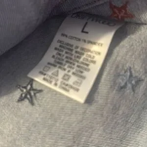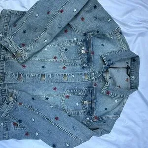 Features: button-front closure, long sleeves, chest pockets, allover star embroidery detail, side pockets
