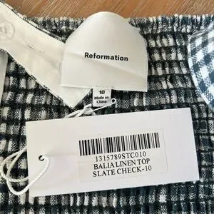 In color “slate check” (blueish grey), new with tags, never worn. Designed to be fitted throughout. Back smocking. This is a lightweight linen fabric - 100% linen.