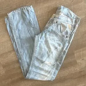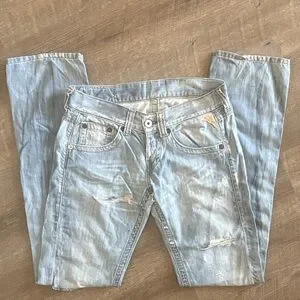 Stylish light blue distressed jeans for women, perfect for a casual look. Comfortable fit with a trendy design.