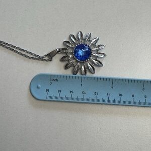Vintage Silvertone Sunburst Pendant Necklace with Blue Faceted Center Stone 24"