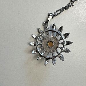 Vintage Silvertone Sunburst Pendant Necklace with Blue Faceted Center Stone