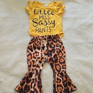 Adorable cheetah print outfit with 'Little Miss Sassy Pants' graphic. Paired with leopard print pants featuring flared bottoms.