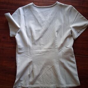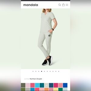 NEW/ NEVER WORN (no tags)XS top and XS bottom Mandala Scrub set. Top is one pocket v-neck. Bottoms are Skinny leg w/ back pockets, front pockets, and 1 multiple pockets on left side. Color difficult to distinguish in pics. Scrubs are not gray or white. PO31-A as seen in pics. Color more very light blue/green hue.