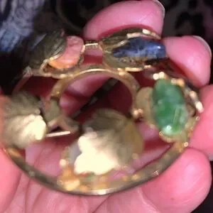 Sarah Coventry vintage brooch features jade, Pearl and 2 other precious stones I’m not familiar with it’s a perfect for adding a touch of sophistication to any outfit. Follow my closet for more brooches and bundle for best deals. Thanks