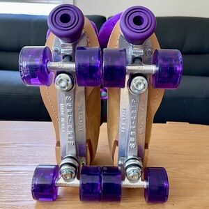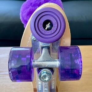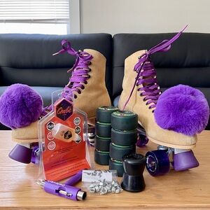 Riedell suede rollerskates. Fully restored - new purple parts including laces, pompoms, wheels, toe stops, and new bearings (old parts and tools included with purchase: see photos).
