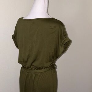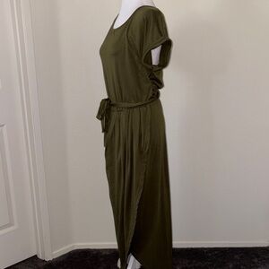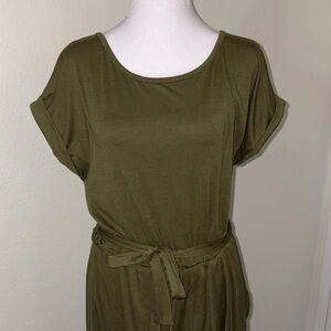 This chic olive maxi dress features a stylish belt, perfect for any occasion. Its elegant design offers both comfort and sophistication.