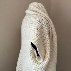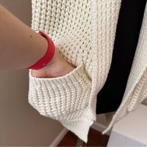 Cozy open-front sweater. Features short sleeves and front pockets. Perfect for layering. Great piece, especially for the fall transition. Just too long for my 5’ frame