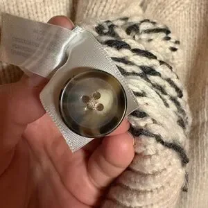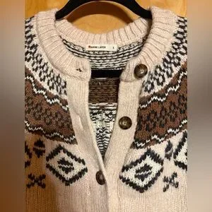 Thick and warm cardigan with intricate patterns. Features cream and brown hues. Perfect for layering. Comes with extra button