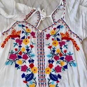 Chic white dress featuring vibrant embroidery. Ideal for a stylish, relaxed look. Angled hemline is flattering. Peekaboo back with tie.