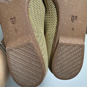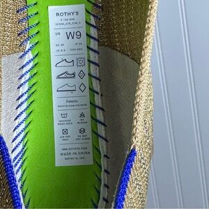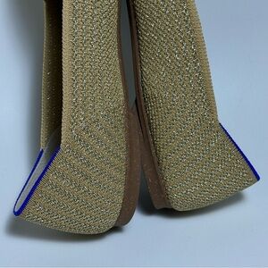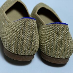 Rothy's tan and blue flats, designed with a sleek slip-on style and a textured woven finish. Comfortable and stylish for everyday wear.