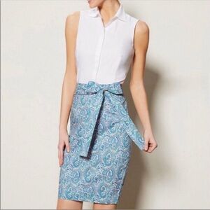 Elegant pencil skirt with a blue and pink paisley pattern. Features a stylish bow detail at the waist. Perfect for a chic look.
