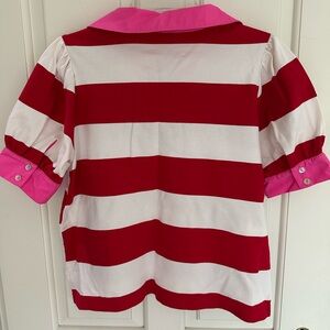 Vibrant top with striking red and pink stripes. Features a bold pink collar.