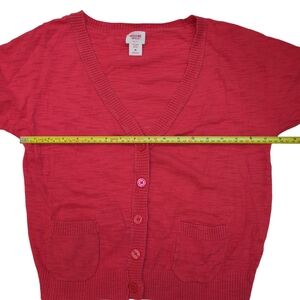 Short sleeve lightweight layering cardigan is 100% cotton and very soft. It's got a slub knit/ distressed style. Button front, v-neck, tiny pockets, Mossimo size women's medium. The color is hard to describe - maybe coral? It's a light red, or dark pink, almost orange? It's a pretty color, whatever it is. Not obnoxious anyway 😜