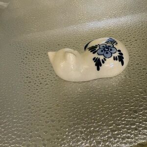 Delft Ceramic Cat Figurine with Blue Floral Design