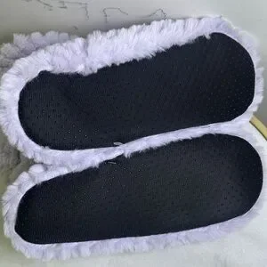 Soft lavender faux fur slippers with a plush interior. Perfect for lounging.
