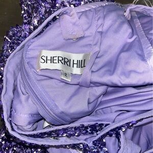 Sherri Hill purple full sequined prom homecoming formal dress. One strap on right side asymmetrical with three straps on back toward the left with snap and eyelet closure. Zipper closure in back. Left side high slit. Back of dress has small train. There is some sequin damage along hem, currently taped to keep more sequins from coming off. Envelop with sequins and purple thread included. Top features built in bra pads. Size 2
