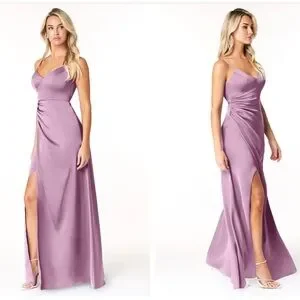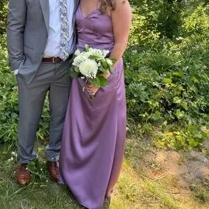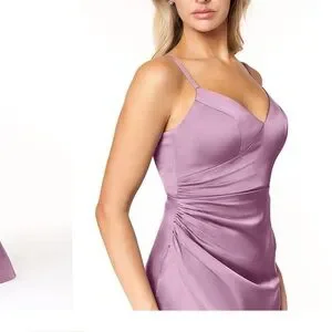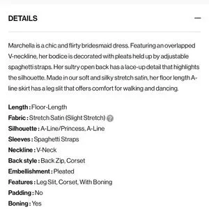 Chic backless design with a side slit. Flattering fit with corset detail. Perfect for elegant occasions. Was worn as a bridesmaid dress once! Would be great for a wedding guest dress or for prom or special occasion.