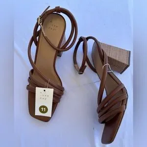 Elegant tan block heels with strappy design. Perfect for versatile styling, Size 11.