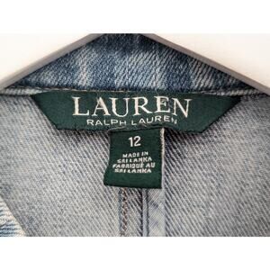 Lauren Ralph Lauren denim jacket, officer’s jacket women’s size 12, indigo wash blue jacket, women’s military style denim blazer, Ralph Lauren casual jacket, women’s tailored denim coat, classic Ralph Lauren indigo jacket, long sleeve button front jacket, women’s utility style jacket, Lauren Ralph Lauren size 12 jacket, versatile denim layering piece, timeless Ralph Lauren jacket.