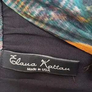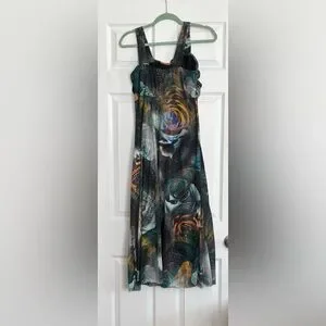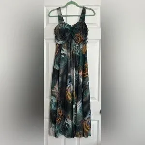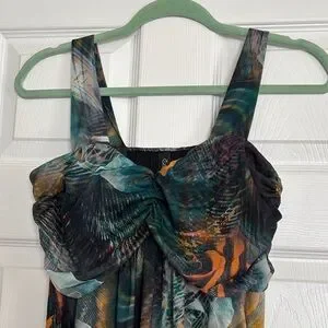Flowy maxi dress with an abstract multicolor design. Features shades of green, orange, and black. Y2K style