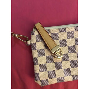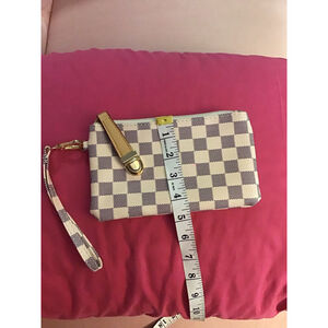 This unbranded clutch wristlet features a white and light blue checkered pattern on a textured material. It has a top zipper closure with gold-tone hardware and a light tan pull tab. The interior is lined with dark fabric, forming a single compartment. A matching detachable wristlet strap, secured by a gold-tone lobster clasp, is included. The clutch measures approximately 7.5 inches in length and 4.5 inches in height. No visible signs of wear are present.
