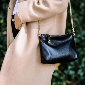 This elegant black leather shoulder bag is perfect for any occasion. Its sleek design and gold chain strap add a touch of sophistication to your outfit.