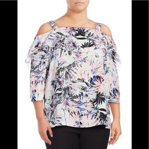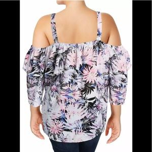 NYDJ Printed Ruffle Blouse Plus 3X (Size 22-24) Martini Plum. NWT. MSRP $108. Ruffled blouse, off the shoulder with straps, square neck, 3/4 sleeves, Polyester, Machine wash, Made in China. Waist: 45in, Hip: 54in.