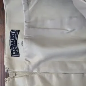 Chic and modern faux leather skirt from Bagatelle Collection in a sleek cream/ivory shade. Features paneled seam detailing, hidden side zipper, and full lining for comfort. A versatile piece that pairs beautifully with sweaters, blouses, or edgy moto jackets.