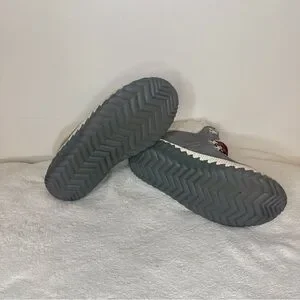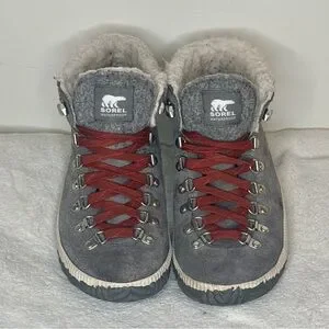 Sorel boots with charcoal exterior and burgundy laces. Ideal for outdoor wear.