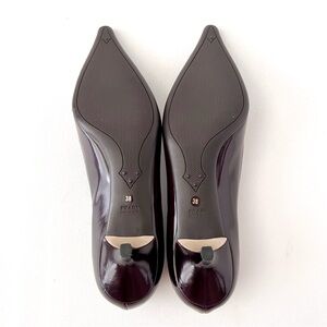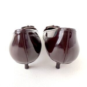 New PRADA | Burgundy Brown Beige Patent Leather Bow Kitten Heel Pointed Pumps 38