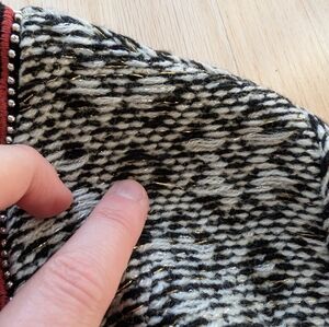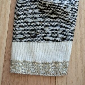 This design is a mixture of holiday chic with the black and white metallic design and a tribal, beaded design. Love the stunning beading work throughout the open cardigan style, and the shawl collar sits higher up on the neck, meaning it's extra cozy!