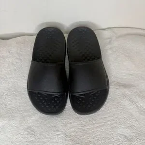 Comfortable black slides for casual wear. Easy slip-on design.