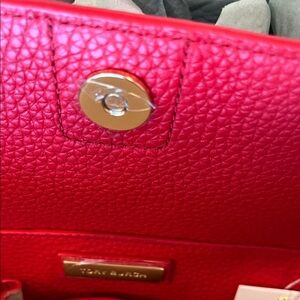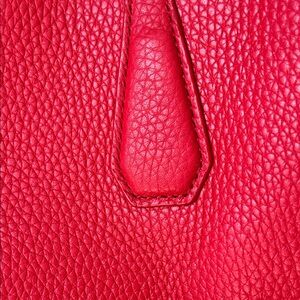 Elegant red tote with signature logo. Perfect for everyday use. Tory Burch tote pebbled textured leather. Features elegant design and spacious interior.